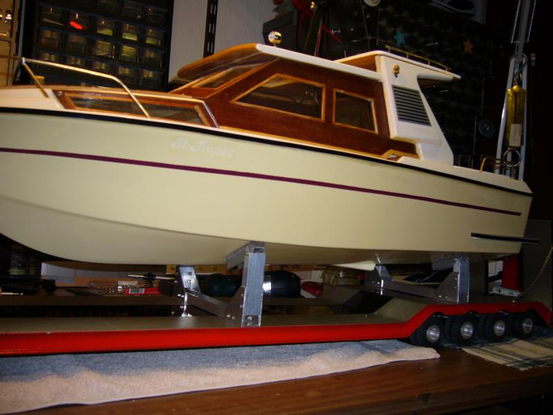 Die Yacht, St.-Tropez, ist 90 cm lang und 25 cm breit; probehalber schon mal mit dem Holzständer auf den Tieflader gestellt.